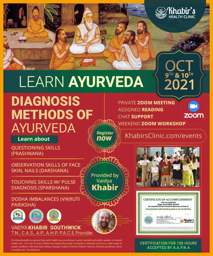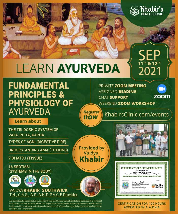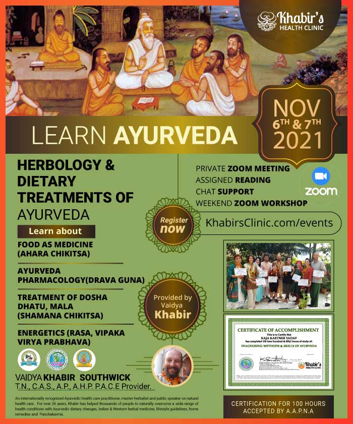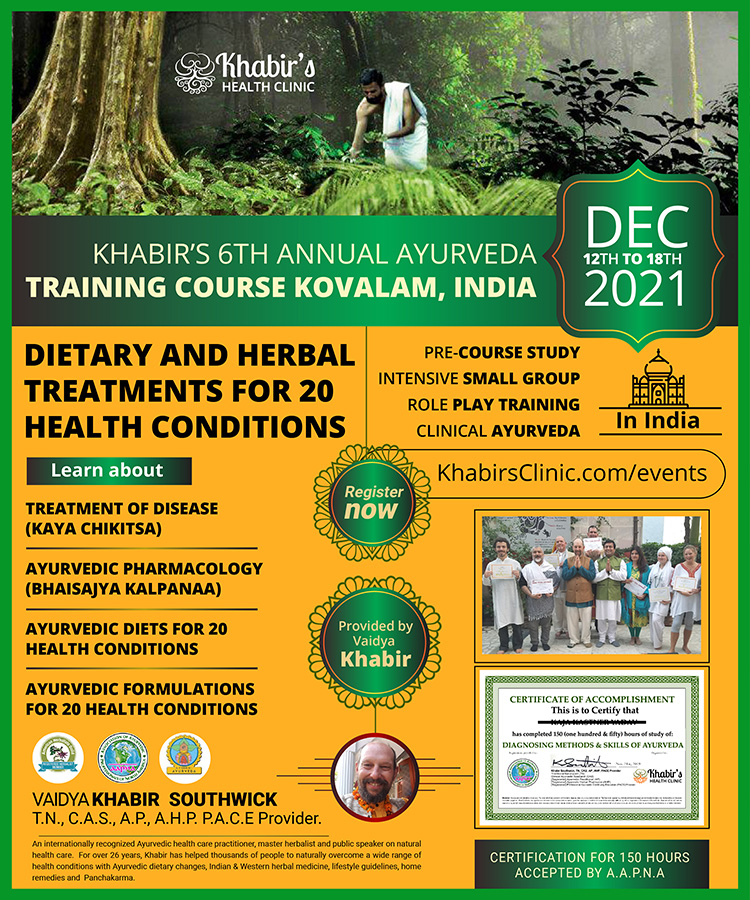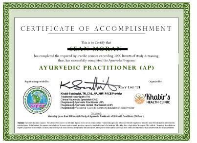 * Completing 500 hours of study with Khabir in his capacity as a Registered Professional Ayurvedic Continuing Education (PACE) Provider by the Association of Ayurvedic Professionals of North America (AAPNA) will allow an individual to register as an [Registered] Ayurvedic Lifestyle Consultant with AAPNA. An additional 500 hours of certificate study, training or internship will allow the individual to register as an [Registered] Ayurveda Practitioner with AAPNA or other associations as per their requirements.